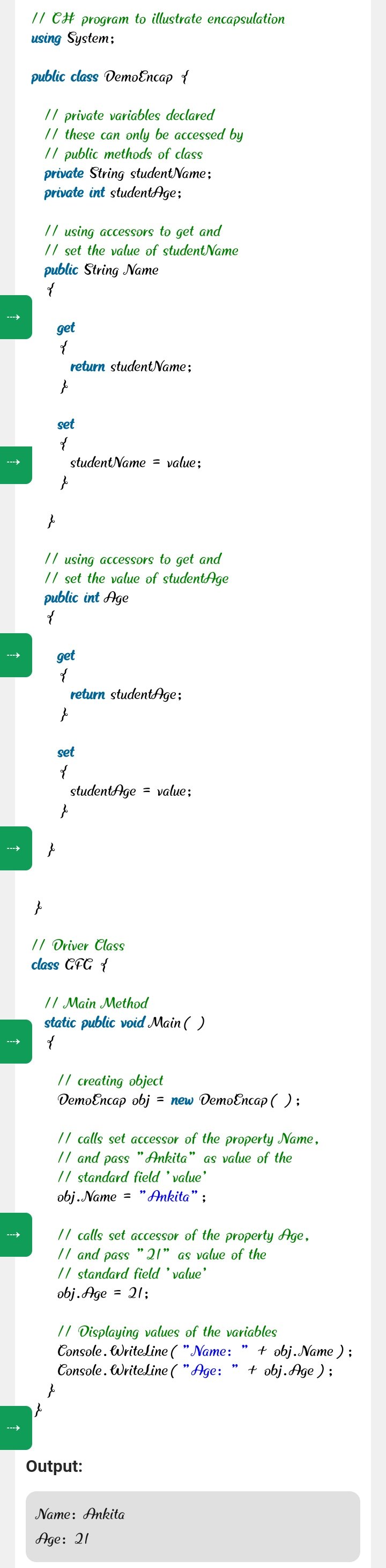 Encapsulation can be achieved by: Declaring all the variables in the class as private and using C# Properties in the class to set and get the values of variables.