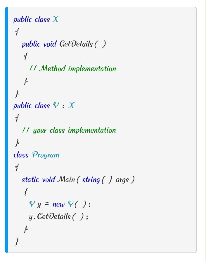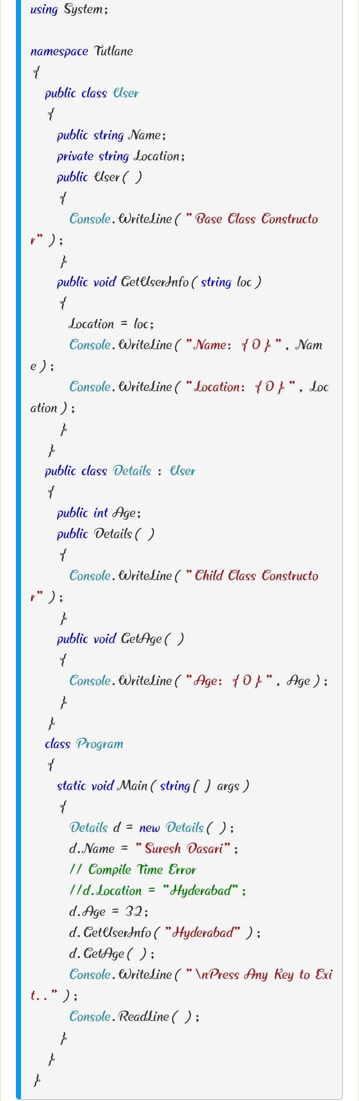 Following is the example of implementing multi-level inheritance in c# programming language.