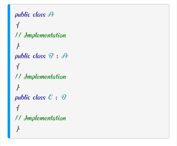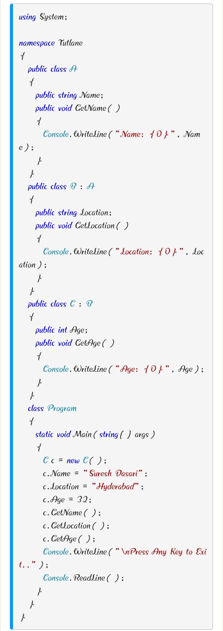 If you observe above code snippet, the class C is derived from class B, and class B is derived from class A, then the class C inherits the members declared in both class B and class A. This is how we can implement multi-level inheritance in our applications.
